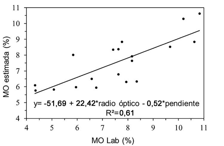Con respecto a los parámetros CIC total, y N (%) no se establecieron coeficientes de determinación significativos (r2≥ 0,55), no siendo el caso de la materia orgánica con 0,61, con el empleo de una regresión lineal múltiple (radio óptico y pendiente como regresoras) (Cuadro 4) (Figura 11).