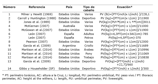 Se encontraron en la literatura catorce ecuaciones disponibles para la estimación del peso de caballos, según la categoría y edad del animal. En Estados Unidos se encontraron diez ecuaciones (Gibbs y Householder, sf; Milner y Hewitt, 1969; Jones et al., 1989; McGowan et al.,2007; Pearson, 2007; Martinson et al., 2014); en España (León, 2007) y Ecuador (Larrea, 2005; Almeida, 2010) se registraron dos por país, mientras que para los países de Argentina (García et al., 2009), Australia (McKiernan, 2007) y Costa Rica (Gamboa, 2012), solo se encontró una ecuación de predicción en cada uno. De forma general, las ecuaciones hacen uso de las medidas de perímetro torácico (PT), la altura a la cruz (AC), la longitud (L) y el perímetro umbilical (PU), lecturas que se obtienen en centímetros o pulgadas y expresan el peso del animal en kilogramos o libras, según el país de origen. Situación que provoca diferencias entre el peso estimado con el real.
