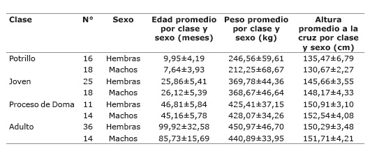 Table 2. Weight, age, and average height at the withers obtained from a sample of 152 horses with Ibero-American phenotype in Costa Rica. Between September 2016 and March 2017.