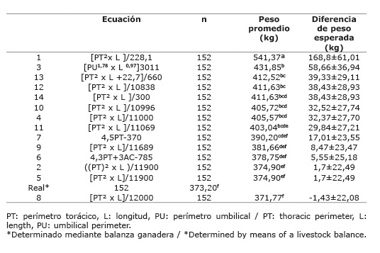 Con los datos alométricos de los 152 animales medidos, se obtuvo el peso estimado para cada uno según las ecuaciones descritas en el Cuadro 4. Se determinó que solo las ecuaciones 2, 5, 6, 7, 8 y 9 (Cuadro 4) permitieron hacer una adecuada estimación del peso de caballos iberoamericanos (p<0,05). Según la información obtenida, las diferencias promedio de peso al utilizar ecuaciones de predicción, fluctuaron entre 1,7 y 168,18 kg de peso vivo en condiciones de sobreestimación y de 1,43 kg cuando se subestimó el peso del animal (Cuadro 4).