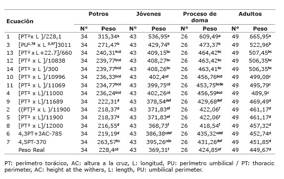 En el caso de las diferentes etapas de vida que presenta el caballo, como lo son: potros (0 a 18 meses), jóvenes (18 a 36 meses), proceso de doma (36 a 60 meses) y adultos (mayores de 60 meses), se dio un comportamiento diferente en la predicción del peso de los animales según la ecuación utilizada (Cuadro 5). En el caso de los potros, doce ecuaciones permitieron estimar un peso que no presentó diferencias significativas con el peso real. Para los animales jóvenes, las ecuaciones se redujeron a cinco, mientras que para animales en proceso de doma y adultos, se podrían utilizar seis ecuaciones para cada categoría.