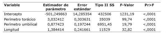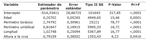 En el caso de las variables perímetro torácico, perímetro umbilical, altura a la cruz, longitud y edad (variables independientes), se realizó un análisis de varianza (ANDEVA) por medio del comando PROC GLM de SAS 9.4 (SAS Institute, 2012), en donde se evaluó el efecto de estas variables sobre el peso de los animales (variable dependiente). Además, se determinó el grado de correlación de estas variables a través del comando PROC CORR de SAS (SAS Institute, 2012). Por último, se realizó un análisis de regresión con la acción Stepwise de SAS/STAT (SAS Institute, 2012), con la intención de obtener un modelo matemático que permita estimar el peso de los animales según las variables independientes que presentan una significancia menor a p<0,05.