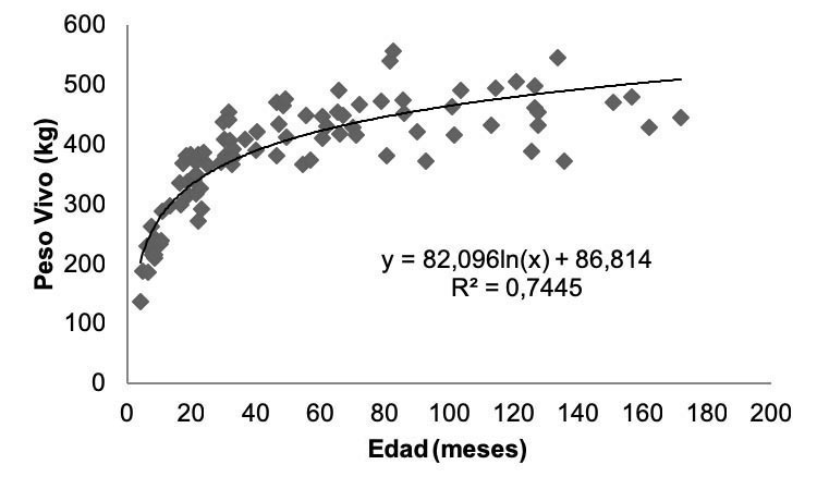 Con la información recolectada en los sistemas de producción sobre la edad, sexo y el peso real de los animales, se procedió a realizar la curva de crecimiento para machos y hembras del caballo iberoamericano criado en Costa Rica.