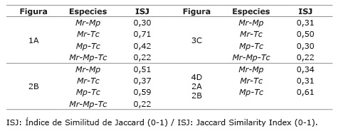 Existen espacios ambientales similares compartidos entre las tres especies (Figura 2A, 2B, 2C), al observar intersecciones entre los tres elipsoides, sin embargo, el nivel de similitud de los nichos fue bajo (Cuadro 1).