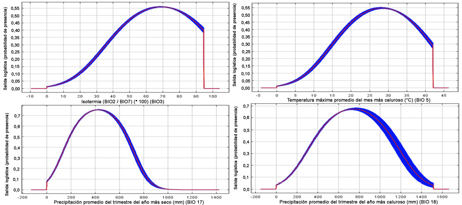 De acuerdo con el proceso de filtración de las variables, los factores ambientales seleccionados para el modelo de distribución de Tc fueron la BIO2 [rango medio diurno - promedio mensual (temperatura máxima - temperatura mínima)], BIO3 [Isotermia (BIO2 / BIO7) (* 100)], BIO5 (temperatura máxima del mes más caluroso), BIO17 (precipitación promedio del trimestre del año más seco), BIO18 (precipitación promedio del trimestre del año más caluroso) y BIO19 (precipitación promedio del trimestre del año más frío). Para el modelo de Mr fueron filtradas las variables BIO3, BIO6 (temperatura mínima del mes más frío), BIO8 (temperatura media del trimestre del año más húmedo), BIO13 (precipitación del mes más húmedo), BIO15 [estacionalidad de la precipitación (coeficiente de variación)] y la BIO18.