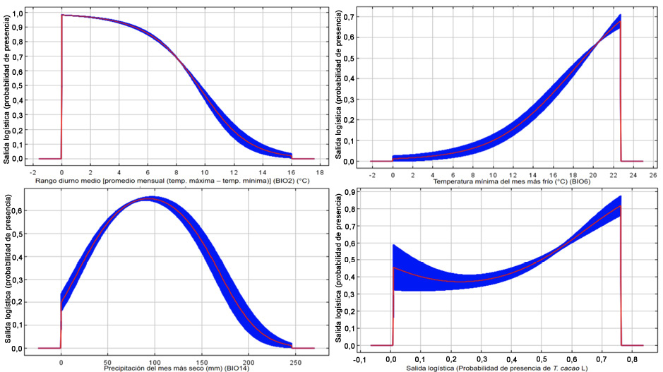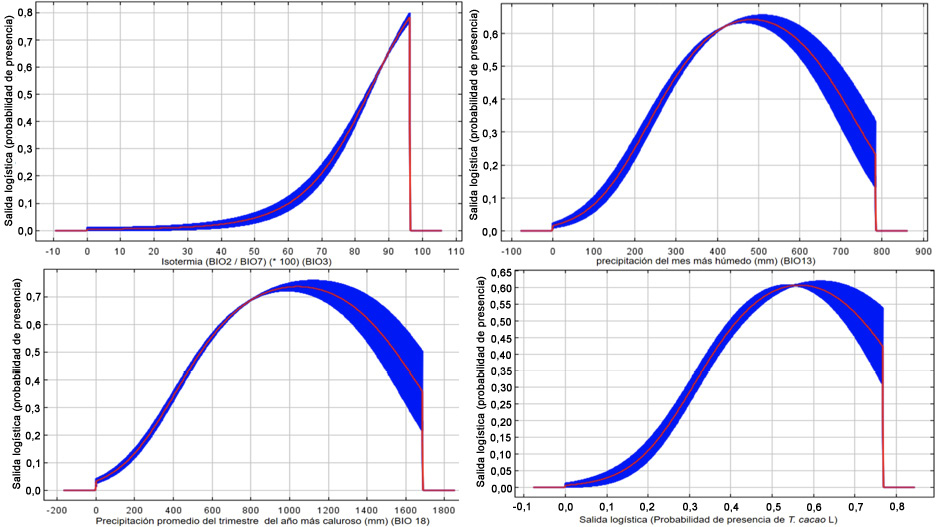 Las regiones de mayor ocurrencia relativa del cacao están asociadas con los dos puntos de diversificación y de mayor diversidad genética de la especie, uno ubicado en el Amazonas alto de Perú y Colombia, y una segunda área ubicada en México y países de Centroamérica (Bartley, 2005; Motamayor et al., 2008; Thomas et al., 2012). Las curvas de respuesta arrojaron que la probabilidad de ocurrencia del cacao es mayor en zonas donde las lluvias son regulares durante las temporadas secas del año, donde la homogeneidad de la variación térmica en todos los meses del año es alta (isotermia) y las temperaturas máximas en el mes más seco son de 25 a 30 °C, condiciones abióticas típicas de las regiones tropicales húmedas de los bosques del Amazonas, que constituyen el centro de origen del cacao (Motamayor et al., 2008; Zhang y Motilal, 2016) y que se encuentran en los rangos de estrés fisiológico de la planta (Schmidt et al., 1993).