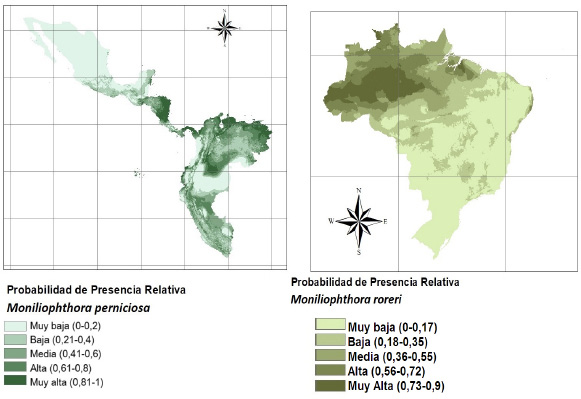 Se identificaron las regiones geográficas con mayor distribución potencial de los patógenos y las características bioclimáticas que favorecerían su probabilidad de presencia en los cultivos de cacao de América. La distribución potencial de M. roreri está influenciada principalmente por las variables de precipitación, como la estacionalidad alta de las lluvias, la precipitación del mes más húmedo (500-600 mm), la precipitación del trimestre más cálido (1000-1200 mm). Para el modelo de M. perniciosa las variables asociadas a la temperatura fueron las más importantes. Variables como el rango diurno medio (2-6 °C) y la temperatura mínima del mes más frío (22 °C), influyeron en una mayor probabilidad de ocurrencia relativa de la escoba de bruja. Esta caracterización bioclimática e identificación geográfica es importante en la toma de decisiones para la ubicación de nuevos cultivos de cacao y en la implementación de adecuadas prácticas de manejo integrado del cultivo.