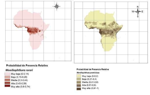 Al realizar la transferencia de los modelos de nicho de los patógenos a las zonas geográficas de África, estos se podrían establecer en las cuencas del río Congo, al igual que las plantas de cacao, que son originarias de los bosques húmedos tropicales de la cuenca alta del río Amazonas (Zhang y Motilal, 2016). La probabilidad de ocurrencia relativa de Mp fue mayor comparada con las obtenidas de la transferencia de Mr, y tendría un mayor potencial de invasión al distribuirse en más zonas geográficas del continente africano. El rango mayor de distribución posible de Mp se relaciona con su alta capacidad adaptativa en ambientes locales (Gramacho et al., 2016) de su nicho fundamental, a su capacidad de infectar varios tejidos de la planta y a la adaptación a climas con temporadas secas.