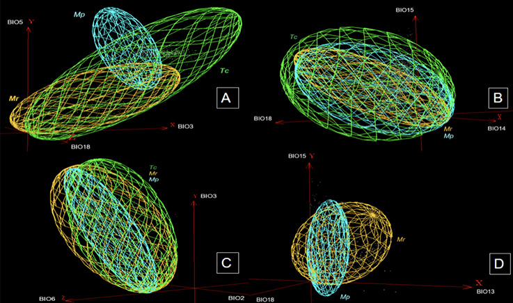 Figura 7. Nichos fundamentales virtuales basados en el elipsoide de mínimo volumen (EMV), construido a partir de registros de ocurrencias de T. cacao L. (Tc), M. roreri (Mr) y M. perniciosa (Mp), proyectados en el espacio ambiental (A) de las variables más importantes para el modelo del cacao, (B) de las condiciones abióticas de precipitación, (C) de la temperatura con mayor contribución de los tres modelos, y (D) con los factores más importantes para el modelo de M. roreri.