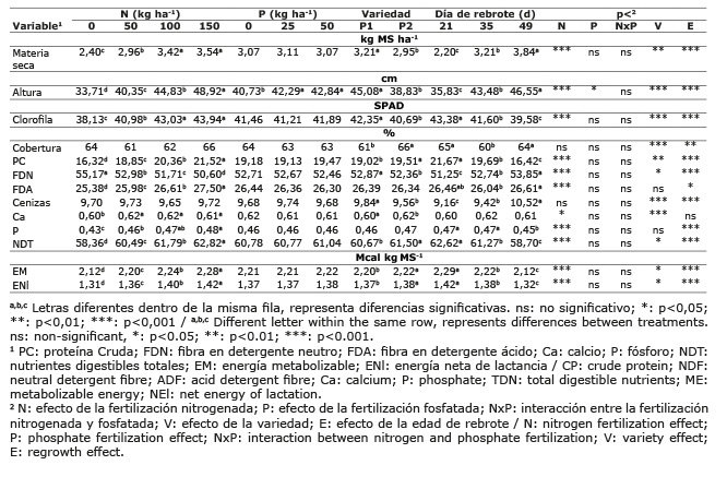 En los raigrases, la fertilización nitrogenada incrementó linealmente (p<0,05) la producción de materia seca, la altura de las plantas y la concentración de clorofila en las dos regiones evaluadas. Además, al incrementar la aplicación de nitrógeno aumentó (p<0,05) la concentración de PC, Ca, P y energía, y disminuyó la de FDN (Cuadro 2 y Cuadro 3). En Mosquera, se evidenció un aumento en la concentración de FDA al incrementar el nivel de fertilización nitrogenada (Cuadro 2), mientras en Tuta aumentó la cobertura y la concentración de cenizas (Cuadro 3). Sin embargo, los niveles crecientes de la fertilización fosfatada no afectaron (p>0,05) las variables en Tuta y únicamente aumentó (p<0,05) la altura de los raigrases en Mosquera (Cuadro 2 y Cuadro 3).