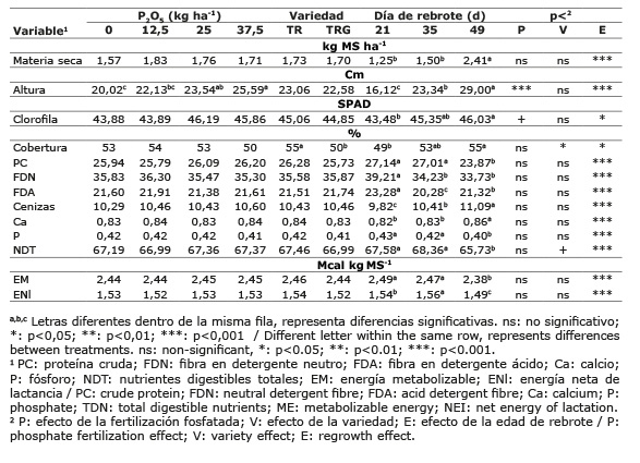 El raigrás P1 presentó una mayor (p<0,05) producción de materia seca y altura respecto al P2 en los dos municipios (Cuadro 2 y Cuadro 3). El P2 presentó una mayor (p<0,05) concentración de PC, NDT y energía, y una menor (p<0,05) concentración de cenizas (Cuadro 2 y Cuadro 3). En Mosquera, el P2 presentó mayor (p<0,05) cobertura, pero menor (p<0,05) clorofila, FDN y Ca respecto a P1 (Cuadro 2), mientras en Tuta, el P1 presentó mayor (p<0,05) contenido de P y menor de PC respecto al P2 (Cuadro 3).