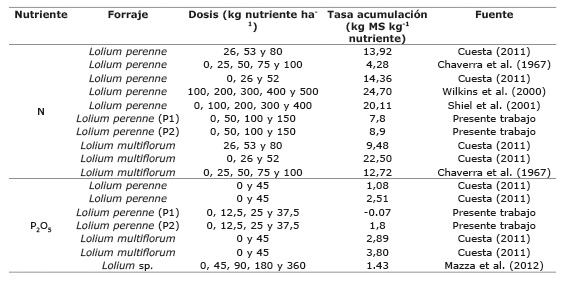 Se han reportado incrementos en la producción de materia seca que varía entre 1 y 4 kg por kg de P2O5 aplicado (Mazza et al., 2012) (Cuadro 6). En este trabajo se encontraron tasas de acumulación de biomasa entre -0,07 y 1,8 kg MS en Mosquera y Tuta, respectivamente, debido a la aplicación de la fertilización fosfórica. La diferencia entre los municipios se podría explicar por el mayor contenido de fósforo en el suelo de Mosquera, lo que generó una menor respuesta respecto a los raigrases sembrados en Tuta. Sin embargo, en ninguna de las fincas se presentaron diferencias significativas entre los niveles de fertilización. Finalmente, la fertilización fosfatada no modificó la concentración de nutrientes en los raigrases, similar a lo encontrado en la literatura (Butler et al., 2007).