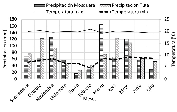 La precipitación en las regiones donde se realizó el trabajo de investigación, tuvo una distribución bimodal, con dos épocas de lluvias (de marzo a mayo y de septiembre a noviembre) y dos de sequía (de julio a agosto y de diciembre a febrero). Mosquera presentó una menor precipitación promedio anual respecto a lo reportado en Tuta (674 vs 890 mm año-1) (Figura 1).