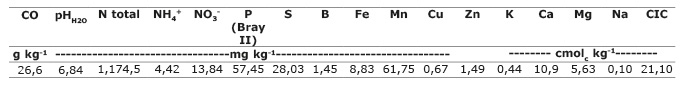 Los resultados de las propiedades químicas (Cuadro 1) se interpretaron por escalas manejadas a nivel nacional (Castro, 2004). El suelo presentó un pH neutro, concentración media de CO y N inorgánico, y alto nivel de fósforo. Entre las bases, se encontraron niveles medios de Na+ y K+ y altos de Mg2+ y Ca2+, además de la capacidad de intercambio catiónico (CIC). Para los elementos menores S, B y Mn los niveles fueron altos, a excepción de Fe, Cu y Zn que fueron bajos. Se ha reportado que a pH neutro se encuentra la mayor disponibilidad de bases (Piraneque, 2008), mientras que en condiciones ácidas la asimilación del P disminuye por combinaciones insolubles con Fe y los microelementos, a excepción del Mo, son más asimilables (Zapata, 2004; Tisdale et al., 2005).