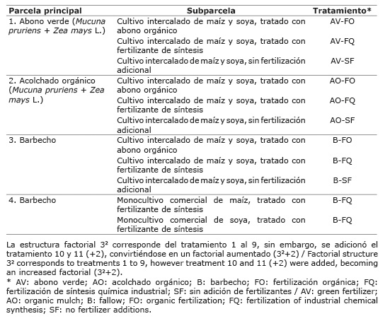 Para cumplir con los objetivos propuestos, se evaluaron once tratamientos (Cuadro 3), bajo un diseño de bloques completos al azar con arreglo factorial 32 (tratamientos 1 al 9) + 2 (tratamientos 10 y 11) con tres repeticiones. Las cuatro parcelas principales las constituyó el componente vegetal [abono verde (AV) o barbecho (B)] previo al establecimiento de los cultivos, más dos con B, todos seguidos por sistemas de cultivos asociados (maíz + soya) y de monocultivos (maíz o soya). Las subparcelas correspondieron a tres diferentes programas de fertilización (compost, fertilizante de síntesis química industrial y ninguna adición).
