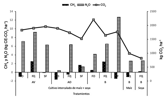 En los cultivos intercalados los tratamientos generaron efectos similares en el flujo de CO2, en este sistema se encontraron mayores flujos que en los monocultivos (Franzluebbers, 2005; Adiku et al., 2010). Los mismos autores indicaron que es posible que la mayor cobertura en la superficie del suelo, a la cual estuvo sujeta al sembrar cultivos intercalados, permitió mayor respiración autotrófica y heterotrófica, lo que originó la liberación del CO2, tanto de los sistemas radiculares de las plantas como de la actividad de organismos en el suelo al descomponer la compleja MO en compuestos más simples. Los flujos acumulados de CO2 encontrados en este ensayo (0,08 a 0,22 kg m-2), coincidieron e incluso fueron menores que los obtenidos por Ferreira (2008) y Fernández y Bojollo (2008), los cuales oscilaron entre 0,07 y 2,2 kg m-2 año-1.