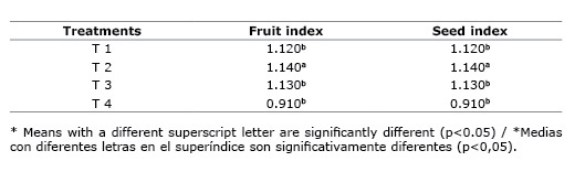 The evaluation of the fruit index and seed index according to the analysis of variance, showed statistically significant differences (p = 0.0001) between treatments (Table 2).