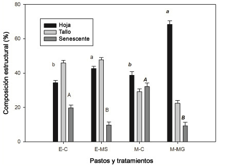 E-C= estrella: control, E-MS= estrella: tratamiento experimental, M-C= Mombasa: control, M-MG= Mombasa: tratamiento experimental. Letras diferentes entre medias de los componentes senescente (mayúsculas) y hoja (minúsculas) fueron differentes en base al erro tipo III