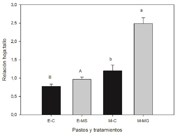 En el pasto Mombasa la relación hoja:tallo incrementó a más del doble con la remoción de la pastura senescente respecto al control (2,49 vs 1,20). Se ha encontrado relaciones hoja:tallo de 3,1 a 1,6 en época lluviosa al aumentar la edad de cosecha de tres a siete semanas (Ramírez-Reynoso et al., 2009), mientras en pasto Tanzania se han encontrado relaciones hoja:tallo superiores (4,3-6,6) bajo un sistema de rotación variable basado en la altura, con respecto a los de un sistema de rotación con días fijos (2,8-3,5) (Euclides et al., 2014).