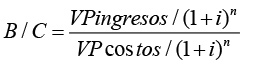 Relación beneficio costo (B/C): es el cociente de los ingresos y los costos totales actualizados, obtenidos a partir de la tasa de oportunidad seleccionada (12 %) (ecuación 3):