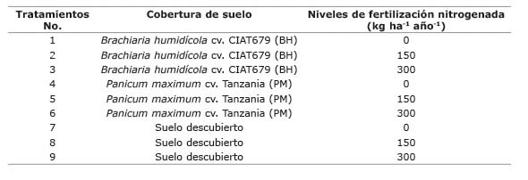 Se utilizó un diseño experimental en bloques completos al azar con arreglo en parcelas divididas, donde la parcela principal estaba constituida por las coberturas de pasturas (Brachiaria humidicola CIAT 679, Panicum maximum cv Tanzania y suelo descubierto), y la subparcela por tres niveles de fertilización nitrogenada (0,150 y 300 kg N ha-1 año-1), con dos repeticiones. El factor de bloqueo correspondió al drenaje del suelo.