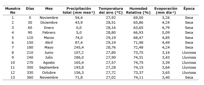 Se registraron variables ambientales como la precipitación (mm mes-1), humedad relativa (%), evaporación (mm día-1), temperatura (°C) máxima, mínima y media registradas diariamente a las 07, 13 y 18 h, usando una estación climatológica localizada en el área de influencia del experimento.