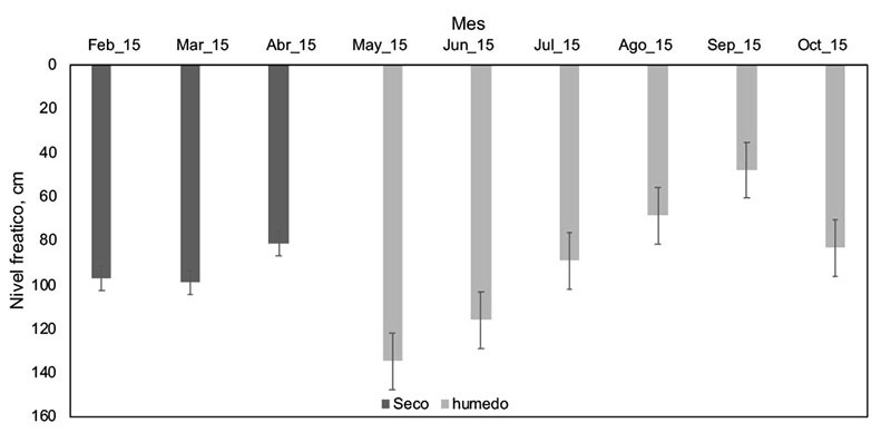 Se realizó un monitoreo del nivel freático del suelo dentro del área de evaluación, mediante una red constituida por veinticuatro de pozos de observación freatimétrica, establecidos en cuadrículas cada 10 m, a una profundidad 2,3 m. Para los pozos se utilizaron tubos perforados de PVC de 2 pulgadas de diámetro, con perforaciones de 4 mm en espiral desde la base hasta 0,20 cm de la parte superior. Las observaciones de la profundidad del nivel freático se realizaron con periodicidad semanal, durante diez meses (febrero a noviembre 2015).