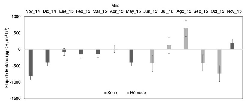 Los resultados para el flujo de metano mostraron variaciones a lo largo del año, presentándose tanto valores negativos como positivos, lo que indica cambios en la capacidad del suelo para actuar como sumidero o emisor de metano. En general, se observó que los flujos negativos ocurrieron en los meses donde prevalecieron precipitaciones inferiores a 100 mm (Cuadro 3), periodo considerado como época seca. Flujos positivos se presentaron en los meses de abril, julio, agosto y noviembre de 2015, cuando las condiciones de precipitación fueron prevalentemente altas. Lo anterior puede estar asociado al desarrollo de condiciones de saturación de humedad en el suelo (Figura 3).