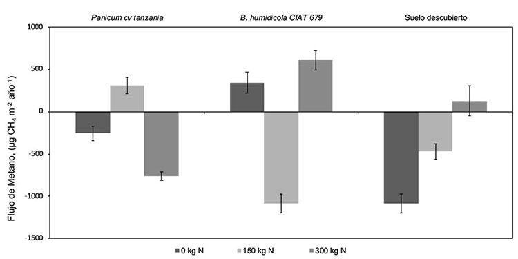 Se observó dentro de estos resultados que en el suelo descubierto, asociado a los niveles de fertilización, los flujos de metano dependieron de las cantidades de fertilización, nitrogenada por año, en dosis inferiores a 150 kg N ha-1 año-1, el suelo se comportó como sumidero de metano (-810 μg de CH4 m-2 h-1); dosis superiores a 150 kg N ha-1 año-1, se inhibió la actividad de los microrganismos metanotrófos en el suelo, generando emisiones de CH4 hacia la atmósfera.
