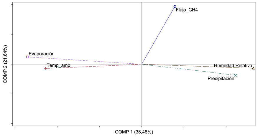 En el análisis de componentes principales, las variables ambientales explicaron hasta el 60 % del comportamiento de los flujos de metano. En estos análisis, se muestra que el componente 1 pudo explicar el 38,48 % de esta variación, mientras que el componente 2 explicó el 21,64 % (Figura 5). Adicionalmente, se evidencia que las variables ambientales que explican un mejor comportamiento de los flujos de metano (primer eje) fueron la humedad relativa (0,88), evaporación (-0,83) y precipitación (0,72).