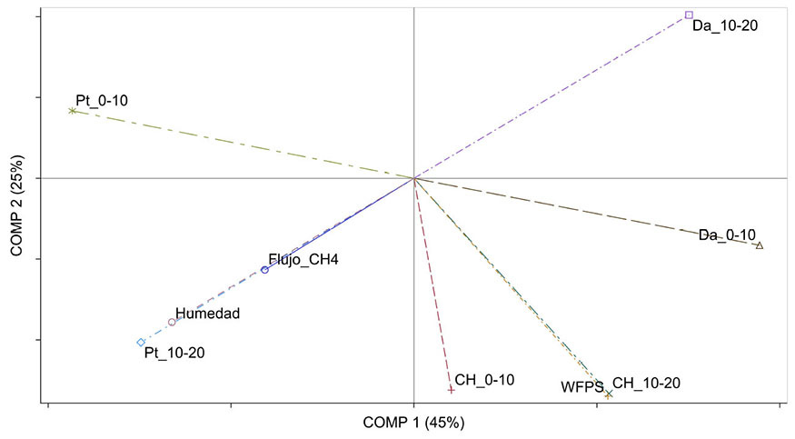 El análisis de componentes principales componente principal sobre las propiedades físicas del suelo explicó el 70 % de los flujos de metano. En este caso, el componente 1 explicó el 45 % de esta variación y el componente 2 representó el 25 % de esta variación (Figura 6). Dentro del primer componente, las variables que explicaron mejor el flujo de metano fueron las relacionadas con la densidad aparente (0,94), la porosidad (-0,93) y la humedad del suelo (-0,66). En el caso del segundo componente, las variables que mejor explicaron el flujo de metano fueron la conductividad hidráulica (-0,65) y el porcentaje de la porosidad ocupada por el agua (-0,67). Los resultados anteriores destacan la importancia de las condiciones aeróbicas y la disponibilidad de oxígeno en el suelo que favorecen los procesos de actividad microbiana, oxidación y absorción de metano. Se encontró una relación directa y positiva entre los flujos de metano y la densidad aparente del suelo y la humedad del suelo, indicando que mayores flujos de metano hacia la atmósfera con valores altos de densidad aparente y humedad del suelo. De manera similar, se encontró una relación inversa con la porosidad, lo que indica flujos de metano más bajos hacia la atmósfera se relacionan con suelos con altos valores de porosidad total (Pt).