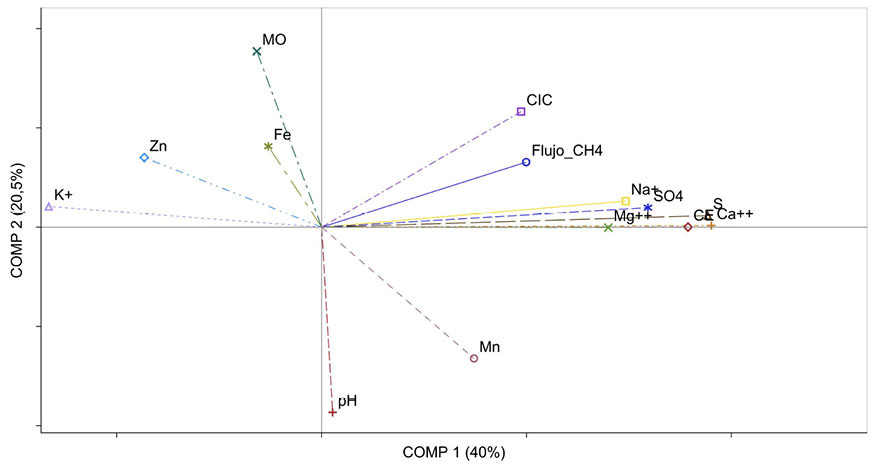En cuanto a las propiedades químicas del suelo, el análisis de componentes principales indicó que los flujos de metano estaban condicionados de la siguiente forma: en el componente 1 las variables que mejor los explicaron fueron el contenido de calcio intercambiable (0,95), azufre (0,94), conductividad eléctrica (0,89) y los sulfatos (0,80), entre otros. Lo anterior indicó una relación directa con calcio, azufre, conductividad eléctrica y sulfatos. En el componente 2, las variables que mejor explicaron el comportamiento de los flujos de metano fueron pH (-0,93), contenido de materia orgánica (0,88), manganeso (-0,66) y capacidad de intercambio catiónico (0,58) (Figura 7). El pH del suelo presentó una relación inversa, lo que indica que, valores de pH más altos produjeron menos flujo de CH4 hacia la atmósfera. El azufre (S) mostró una correlación positiva significativa con los flujos de CH4, lo que indica que a mayor contenido de S, mayor potencial de oxidación de metano en el suelo (sumidero). En este sentido, algunos autores afirmaron que el contenido de sulfato (SO4) en el suelo favorece la acumulación de CH4 (sumidero), debido al aumento de la actividad de las bacterias reductoras de SO4 (Reay et al., 2007).