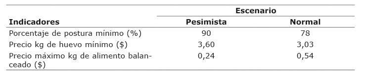 En el caso del porcentaje de postura, los valores utilizados en el análisis de sensibilidad correspondieron a los límites inferior, promedio y superior que indica la guía de manejo de la línea genética Isa Brown, mientras que el precio de venta del huevo y de compra del alimento balanceado los afectó por ±5 %. Bajo estas mismas circunstancias, los valores máximos y mínimos de los indicadores sensibilizados que podría soportar el modelo propuesto, bajo los escenarios pesimista y normal, para que este sea viable, manteniendo las demás variables constantes, se muestran en el Cuadro 6.