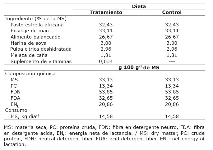 Las vacas se mantuvieron con la misma dieta durante todo el tiempo de prueba, con el fin de evitar la variabilidad y que el suplemento de vitaminas del complejo B sobrepasante al rumen fuera la única diferencia.