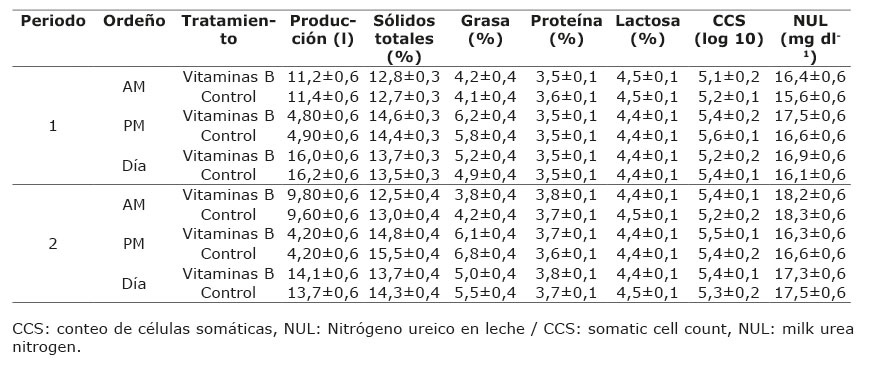 El suplementar a las vacas con un complejo de vitaminas B recubierto en este experimento no afectó los valores obtenidos de CCS (aproximadamente alrededor de las 500 000 células ml-1 o 5,1±0,2 log10), situación que concuerda con el primer experimento de Saccadura et al. (2008), en donde no hubo diferencia en el CCS entre el control y el tratamiento de 3,0 g de vitaminas B protegidas (281 000 CCS).