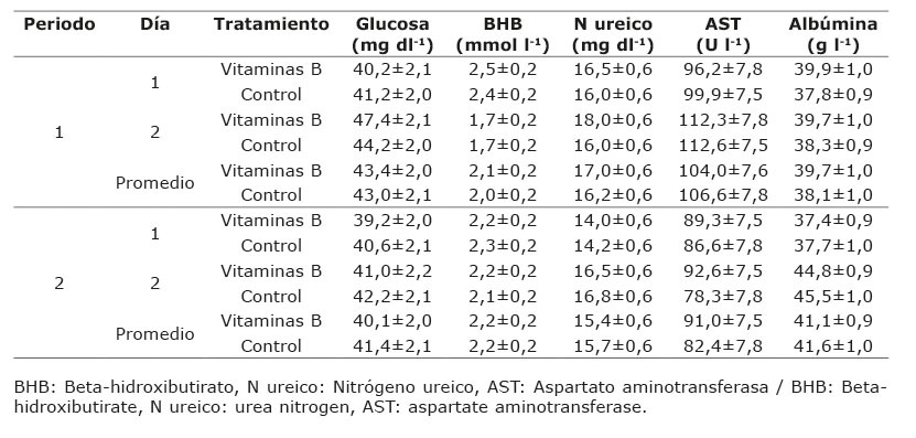 Para el periodo 2 los resultados para el grupo con suplemento de vitaminas B fue de 40,1±2,0 mg dl-1 de glucosa, 2,2±0,2 mmol l-1 de BHBA, 15,4±0,6 mmol l-1 de nitrógeno ureico, 91,0±7,5 U l-1 de AST y 41,1±0,9 g l-1 de albúmina. El grupo control presentó concentraciones de glucosa de 41,4±2,1 mg dl-1, 2,2±0,2 mmol l-1 de BHBA, 15,7±0,6 mg dl-1 de nitrógeno ureico, 82,4±7,8 U l-1 de AST y 41,6±1,0 g l-1 de albúmina.