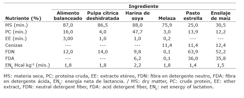 Semanalmente se recolectaron muestras de la RPM que se trasladaron al laboratorio de la Estación Experimental Alfredo Volio Mata para su respectivo análisis. Los análisis efectuados fueron materia seca (MS) (humedad por estufa a 105 ºC), proteína cruda (PC) (AOAC 2001.11), fibra en detergente ácido (FDA) (AOAC 973.18), fibra en detergente neutro (FDN) (AOAC 2002.04), lignina, celulosa, hemicelulosa y cenizas (AOAC 942.05). Los datos de la composición nutricional de los ingredientes utilizados en las dietas se muestran el Cuadro 1. Los valores nutricionales para el alimento balanceado, pulpa cítrica deshidratada y harina de soya se tomaron de la etiqueta del fabricante. La estimación de la ENL (Mcal kg-1) se realizó mediante el modelo del NRC (2001).