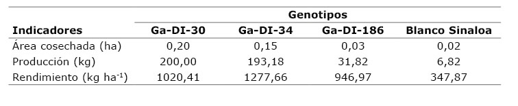 Table 2. Production and yield of chickpea (Cicer arietinum) genotypes harvested in Mayabeque, campaign 2017/2018. Cuba.