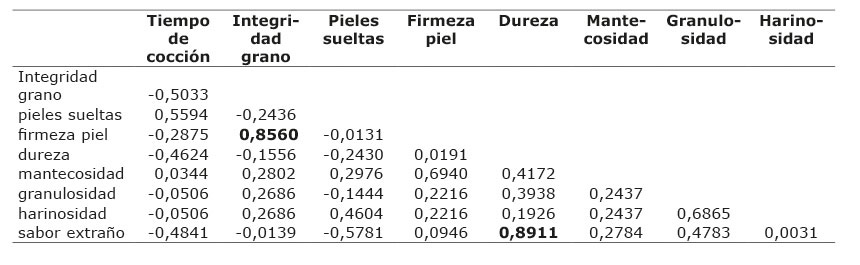 De manera general, las degustaciones realizadas a los granos de once genotipos importados desde ICARDA (Ga-DI-8, 27, 30, 34, 74, 133, 186, 191 y 242) y dos donados por INIFAT (Negro IEC y WR-315), han mostrado aceptables atributos culinarios para la elaboración del caldo. La valoración (utilizando los puntajes alto, medio, bajo) ha calificado la integridad del grano y la firmeza de la piel con una alta correlación positiva entre ambos, mientras que la presencia de pieles sueltas, dureza de la piel, mantecosidad, granulosidad, harinosidad, han calificado como media, en tanto, el sabor extraño ha sido valorado como bajo, este último altamente correlacionado con la dureza del grano (Cuadro 3).