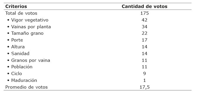 Los criterios más utilizados (Cuadro 1) para seleccionar los cultivares de interés fueron: vigor vegetativo (con categoría de bueno a muy bueno en el 80 % de los cultivares seleccionados), número de vainas por planta (70 % de los cultivares seleccionados presentaron más de 115 vainas por planta) y tamaño del grano (50 % de los cultivares elegidos presentaron granos grandes con masa superior a 40 g/100 granos). Estos criterios alcanzaron valores por encima del promedio de votos emitidos (Cárdenas et al., 2016).