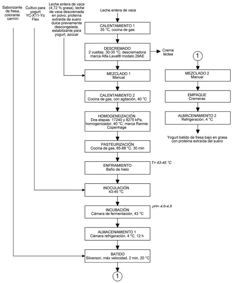La formulación del yogur batido de fresa bajo en grasa, se definió mediante pruebas preliminares y se realizó con base en la composición de sólidos no grasos (SNG), sólidos grasos (SG) y sólidos totales (ST) de un yogur batido bajo en grasa reportado en la literatura. Asimismo, se tomó en cuenta las especificaciones para un yogur semidescremado establecidas en la norma nacional para el yogur (yogurt) y el yogur azucarado (Figura 1) (Ministerio de Economía, Industria y Comercio, 2008).