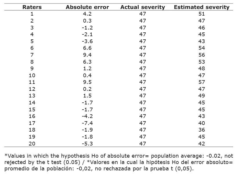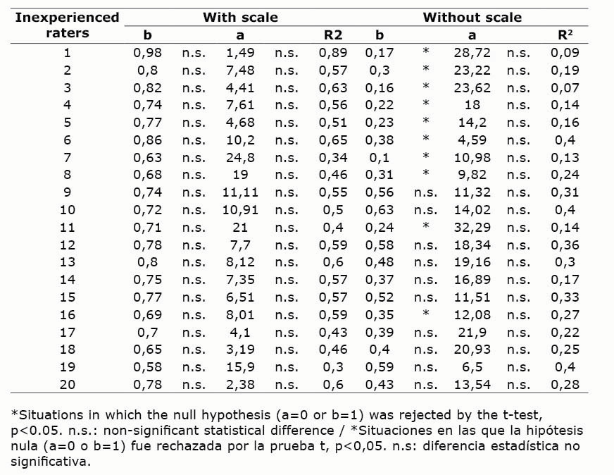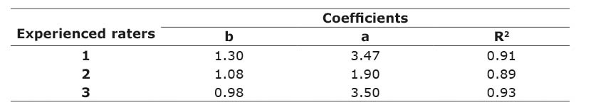 The coefficients (b) of the regression line between actual and estimated severity, was higher for experienced raters, with and without the use of the scale (Tables 1 and 2).