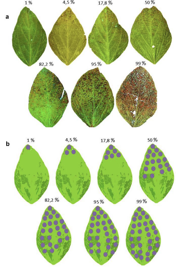 Figure 1. a. Scale to quantify Cercospora leaf blight (Cercospora kikuchii) on soybean (Glycine max) leaflets. b. Diagrammatic scale to quantify Cercospora leaf blight on soybean leaflets. Universidad Nacional Del Noroeste de la Provincia de Buenos Aires, Pergamino Buenos Aires, Argentina. 2017.
