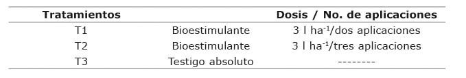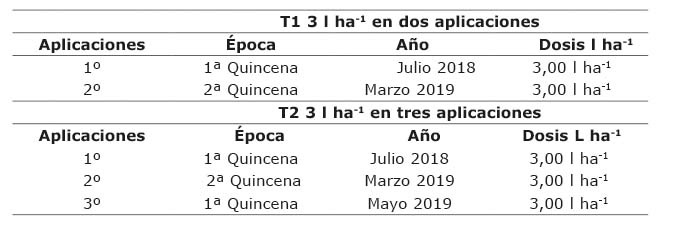 Se realizaron aplicaciones foliares a razón de 3 l ha-1, en dos y tres aplicaciones al cultivo, en dos fases fenológicas, en un volumen final de 400 l ha-1 (Cuadro 2), con una bomba de aspersión de alta presión marca ECHO, con capacidad de 25 l, de doble pistón con boquillas tipo MN-D-6 y un gasto por boquilla de 1,16 l min-1.
