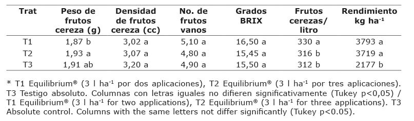 Con respecto a la calidad de los frutos, se pudo comprobar que en el peso del fruto cereza, el tratamiento 2 (3 l ha-1 con tres aplicaciones) mostró el mayor valor (1,93 g) con respecto al tratamiento 1 (3 l ha-1 con dos aplicaciones), con valores por debajo de 1,50 g y con respecto al testigo, que manifestó pesos por debajo de 1 g.