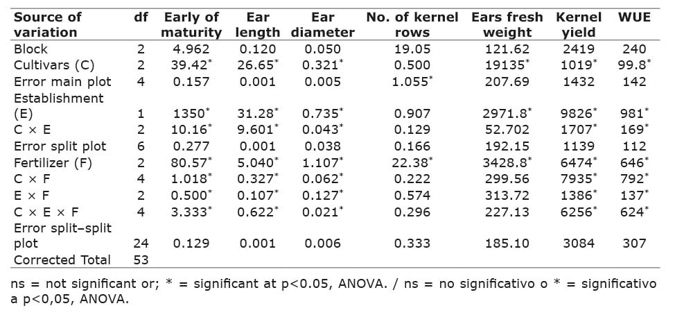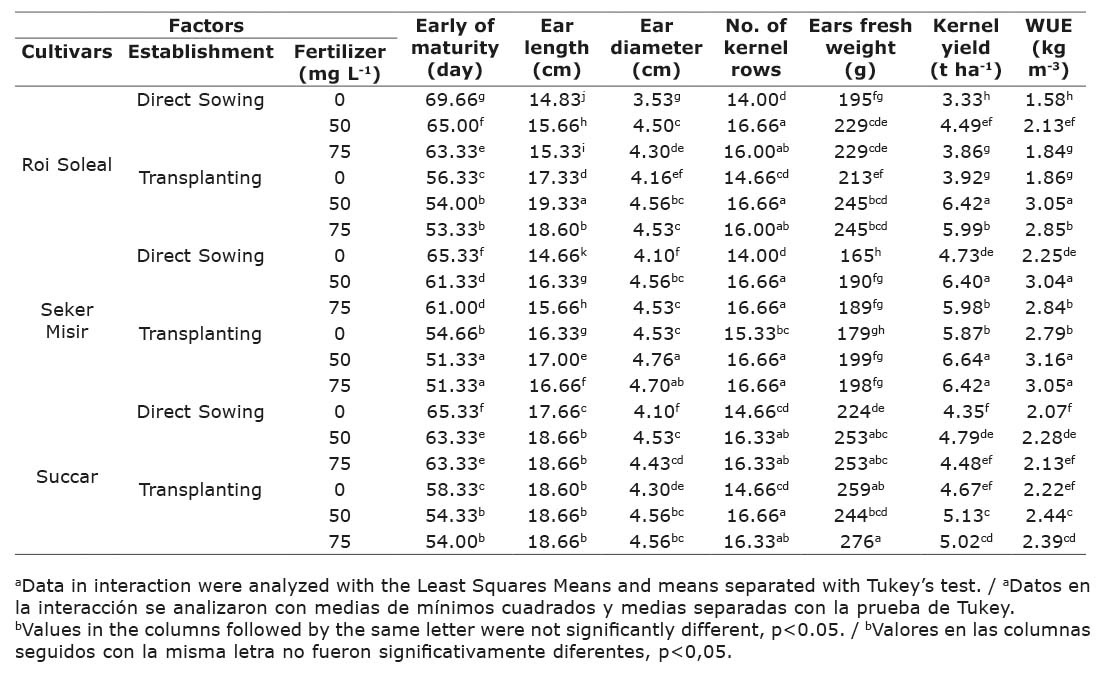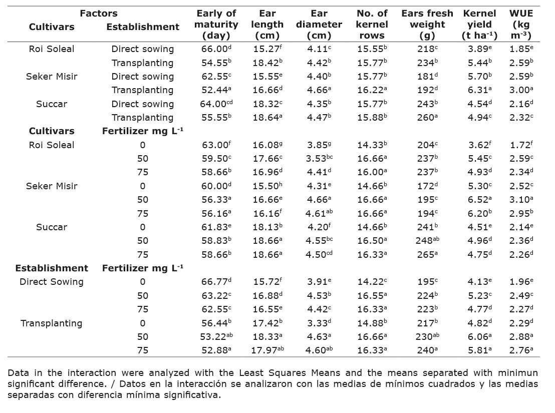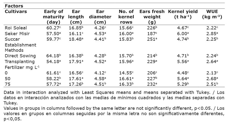 Cuadro 3. Comparación de medias, efectos de las interacciones entre el cultivar × métodos de establecimiento, cultivar × fertilizante y los métodos de establecimiento × fertilizante, sobre el tiempo de maduración, la longitud y el diámetro de las espigas, el número de hileras de granos, el peso fresco de las mazorcas, la productividad de grano y el uso del agua (WUE) en el maíz dulce (Zea mays). Research Station of Horticulture Department and Landscape Gardening Architecture, University of Diyala, Baqubah, Iraq, 19 de marzo al 20 de junio de 2020.
