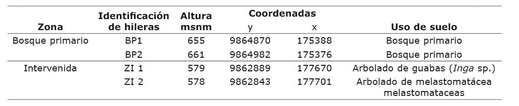 De las plantas germinadas se seleccionaron aquellas que presentaron una altura mínima de 9 cm y se trasplantaron a los sititos de ensayo, se distribuyeron de forma equitativa en dos hileras ubicadas en zona de bosque primario con alturas entre 655 y 661 msnm y dos hileras ubicadas en zona intervenida con alturas entre 578 y 579 msnm, con un diseño experimental de bloques al azar. Se seleccionaron espacios homogéneos y se distribuyó las hileras al azar en los sitios indicados y en cada punto de ubicación de la planta se colocó una baliza con la punta pintada de rojo, las hileras tuvieron como dimensiones 1 m de ancho por 25 m de largo, con una distancia de 2 m entre plantas, se eliminó la vegetación 50 cm alrededor de cada planta y se consideró una distancia lineal de 3 km entre las hileras ubicadas en bosque primario. El uso de suelo y coordenadas de las hileras se presentan en la Figura 1 y en el Cuadro 1.
