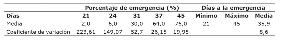 Los frutos colectados midieron de 4 a 6 cm de diámetro (Figura 2), los cuales presentaron de 3 a 9 semillas. Se reportó un peso promedio por 10 semillas de 59,3 g, sus diámetros promedios fueron: longitudinal de 2,33 cm con un coeficiente de variación del 13 % y transversal de 1,3 cm con un coeficiente de variación del 16 %. La curva de imbibición mostró el máximo incremento en la hora 4 (Figura 3), con un 14 % de ganancia en peso, las semillas estuvieron en capacidad de absorber agua. El promedio de los días a la emergencia fue de 35,9 días desde la siembra (Cuadro 2). Las semillas germinaron a partir de los 21 días desde la siembra en la réplica 1, 24 días en la réplica 2 y en el resto de réplicas a partir de los 31 días. Se observó que el coeficiente de variación disminuyó a medida que pasó el tiempo, con la menor variabilidad entre las réplicas a los 45 días.