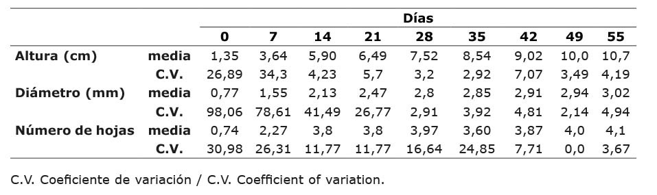 La altura de la planta obtuvo a los 55 días un promedio de 10,7 cm, (Cuadro 3). En el diámetro del tallo se alcanzó una media de 3,02 mm a los 55 días y en las dos medidas el mayor promedio se registró en la réplica 2. En esta medida los mayores coeficientes de variación se registraron a los 0 y 7 días y disminuyó para el resto de días. Las plantas alcanzaron un promedio de 4,1 hojas, obteniéndose el mayor promedio a los 55 días, a partir del día 49 no se registró variabilidad entre réplicas. De las plantas germinadas se seleccionaron 44 individuos que presentaron el rango de altura indicado en la metodología, para su instalación en las hileras en campo.
