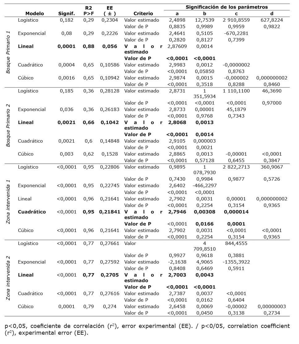 En la variable diámetro del tallo se seleccionó los modelos donde los parámetros resultaron significativos, a pesar de que otros modelos presentaron mayor R2, escogiéndose el modelo lineal en las hileras bosque primario 1 y 2 (BP-1) (BP-2) y zona intervenida 2 (ZI- 2), y cuadrático en la zona intervenida 1(ZI-1) (Cuadro 5).